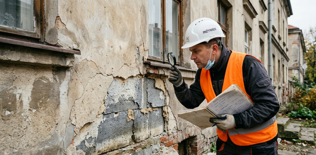 Podstawą jest profesjonalna ocena stanu istniejących ścian zewnętrznych. Powinien ją przeprowadzić doświadczony kierownik budowy lub inspektor nadzoru. Weryfikacja obejmuje: