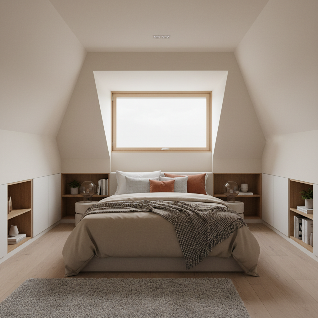 Przytulna i stylowo urządzona sypialnia na poddaszu. Ściany i skosy pomalowane są na jasny, ciepły kolor. Przez duże okno dachowe wpada miękkie światło, oświetlając wygodne łóżko. Pod niższymi skosami znajdują się wykonane na wymiar szafki i półki, pokazując inteligentne wykorzystanie trudnej przestrzeni.