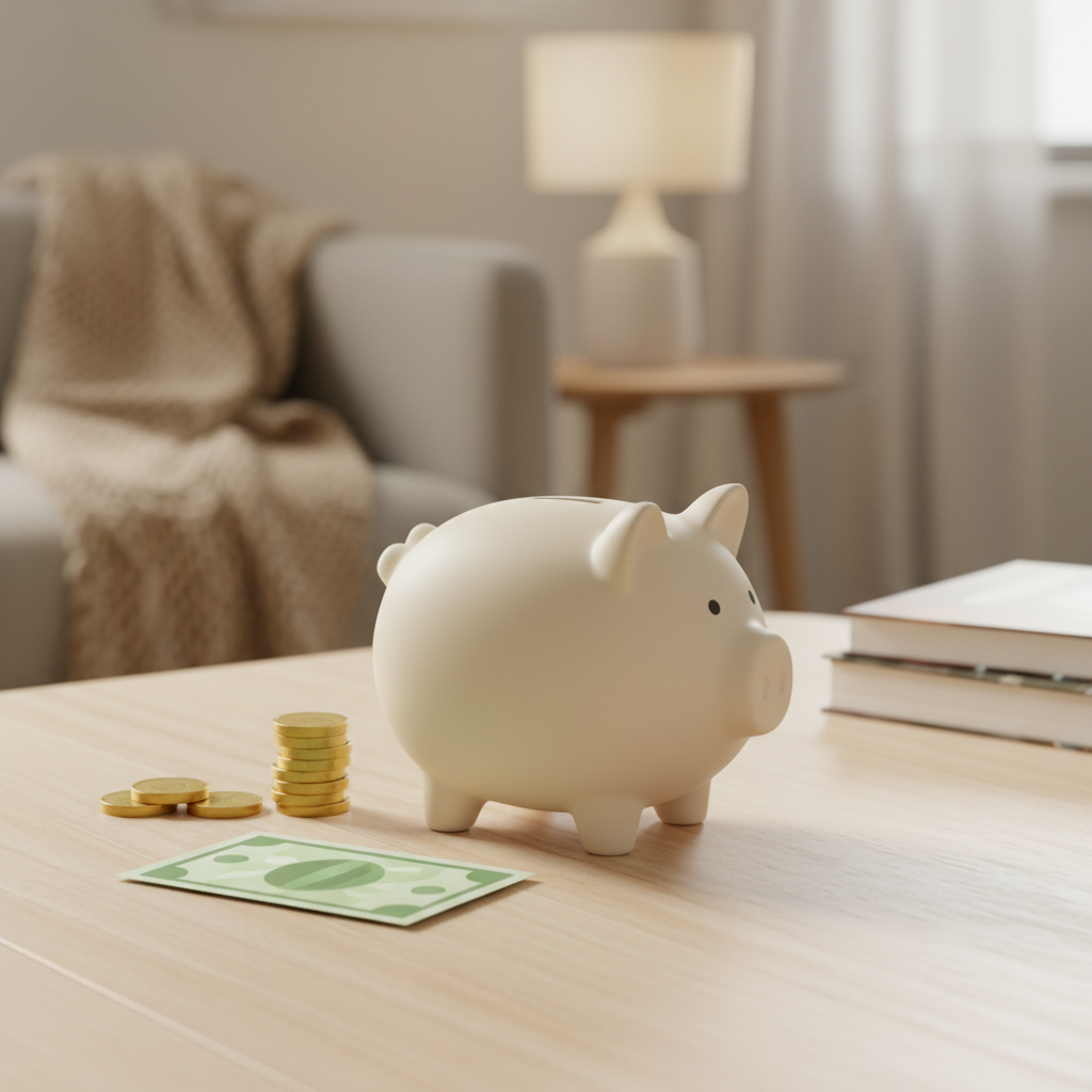 Estetyczna, minimalistyczna grafika przedstawiająca ceramiczną świnkę-skarbonkę na drewnianym stole. Obok leży kilka monet i jeden banknot. W tle widać fragment przytulnego salonu. Obraz ma ciepłą kolorystykę i symbolizuje mądre, domowe oszczędzanie.
