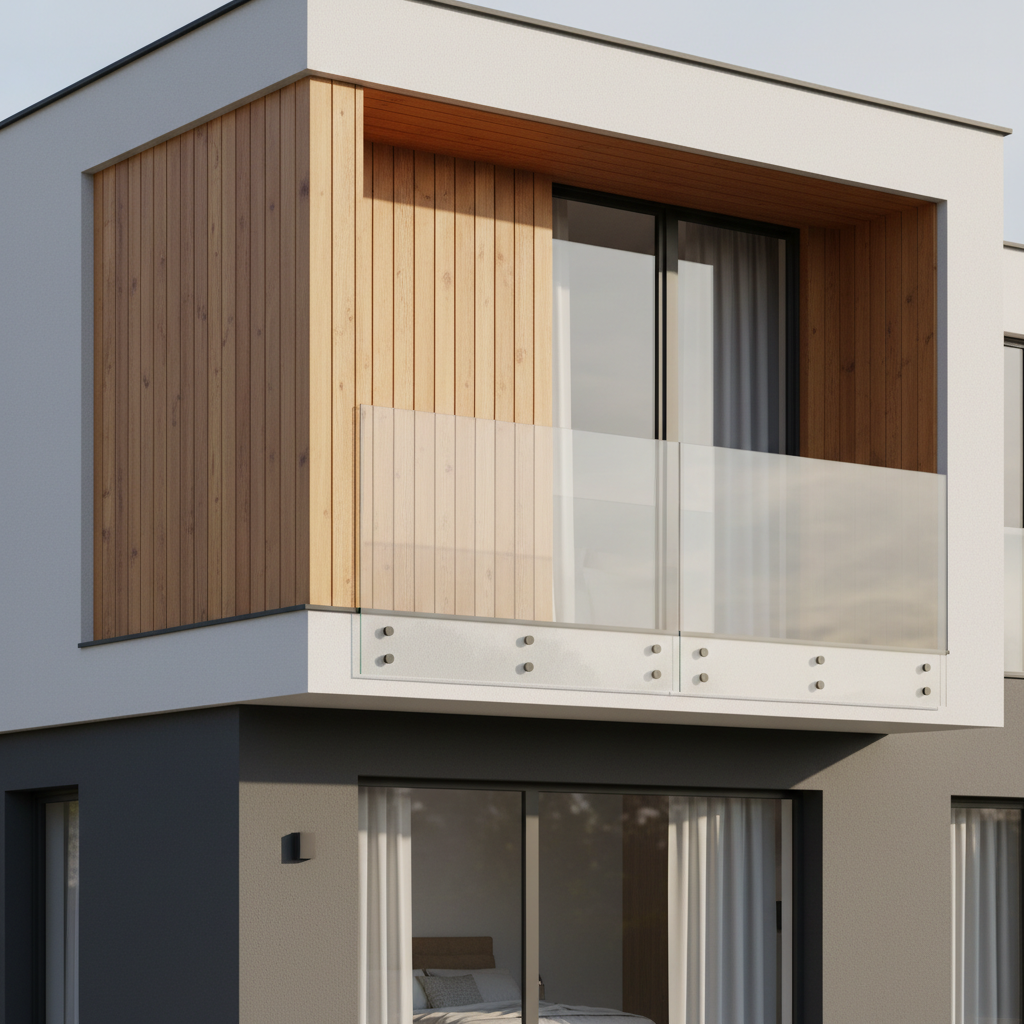Zbliżenie na fragment elewacji nowoczesnego domu jednorodzinnego. Fasada w odcieniach bieli i szarości jest przełamana ciepłym akcentem drewnianej okładziny. Na piętrze widać minimalistyczny, szklany balkon, który stanowi integralną część sypialni, dodając bryle lekkości i elegancji.