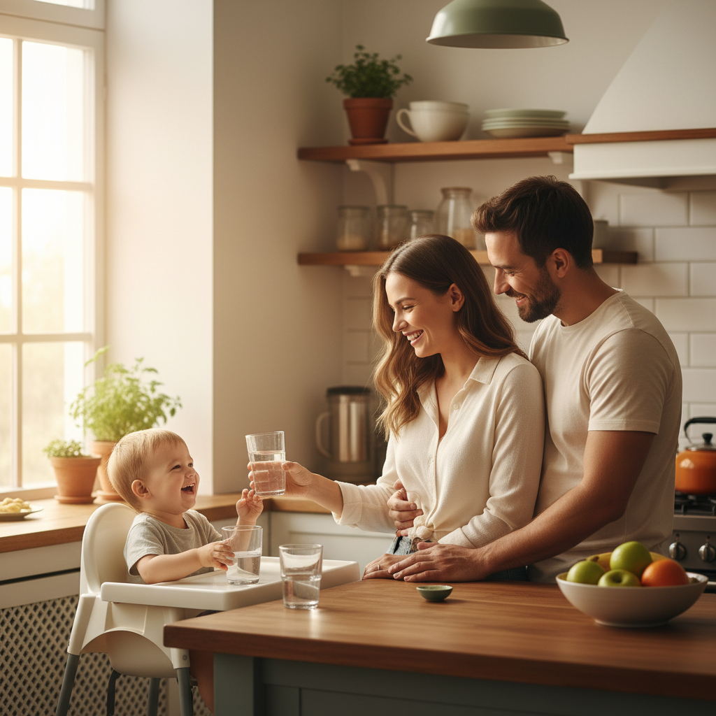 Ciepła, rodzinna scena w kuchni. Rodzice z uśmiechem podają dziecku szklankę czystej wody. Oświetlenie jest miękkie i naturalne, a cała scena emanuje spokojem, zdrowiem i poczuciem bezpieczeństwa.