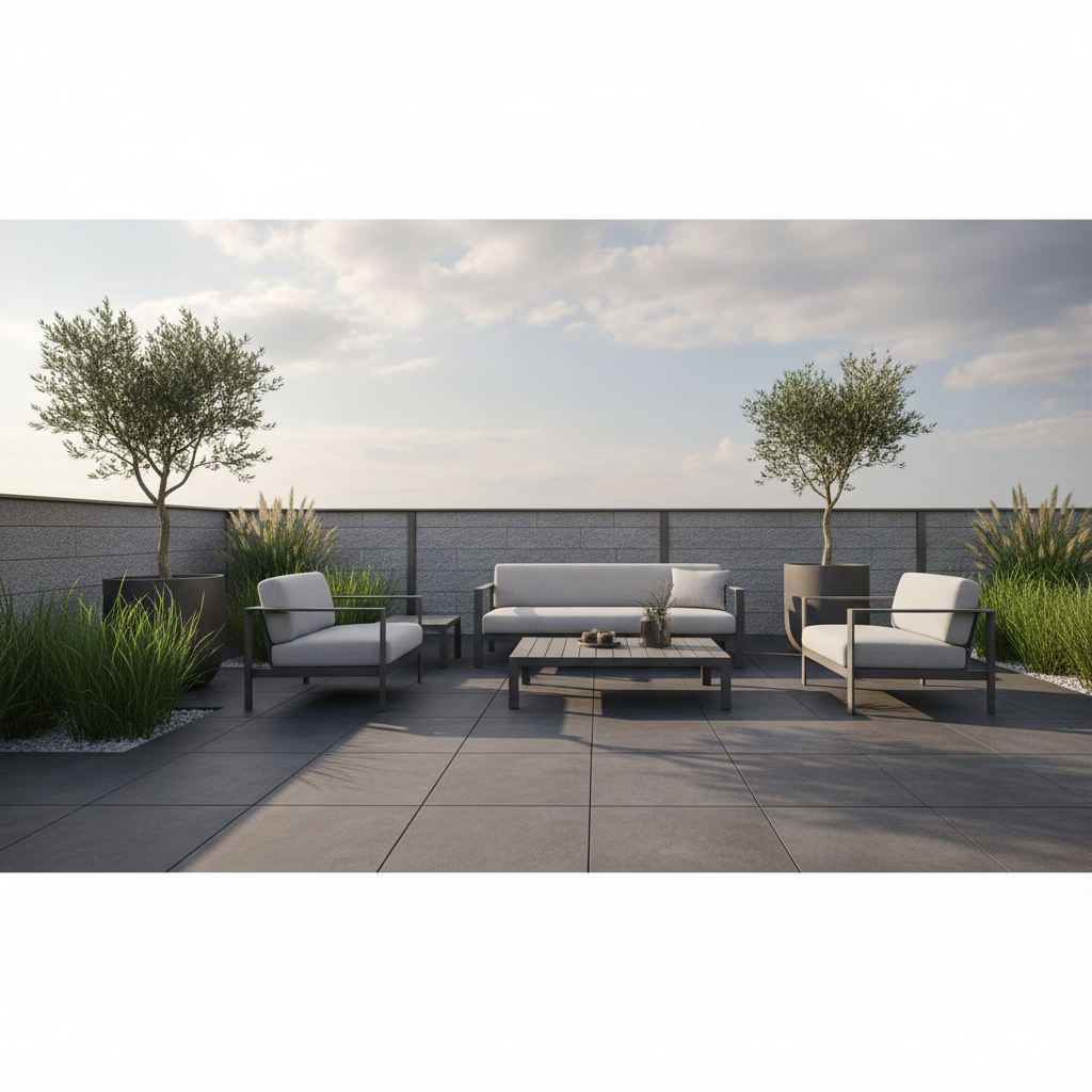 Szeroki kadr przedstawiający nowoczesny taras wyłożony dużymi, grafitowymi płytami z systemu Maxima. W tle, jako ogrodzenie tarasu, widoczny jest niski murek z popielatego ogrodzenia strukturalnego Libet. Całość tworzy spójną i elegancką przestrzeń wypoczynkową z minimalistycznymi meblami ogrodowymi.