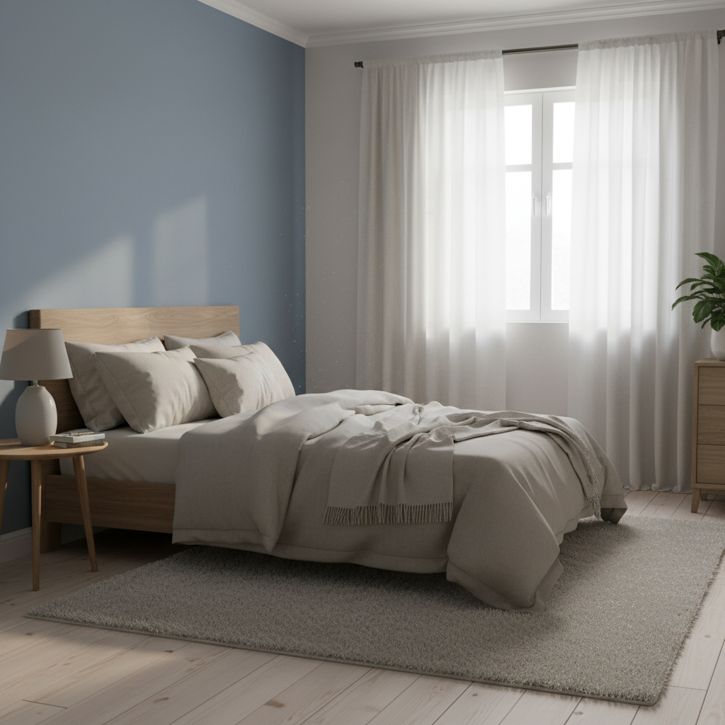 Spokojna i przytulna sypialnia ze ścianami pomalowanymi na kojący, zgaszony błękit. Na tle ściany za łóżkiem prosta, drewniana rama. Pościel w neutralnych, beżowych odcieniach, a przez delikatne, lniane zasłony wpada miękkie, poranne światło.