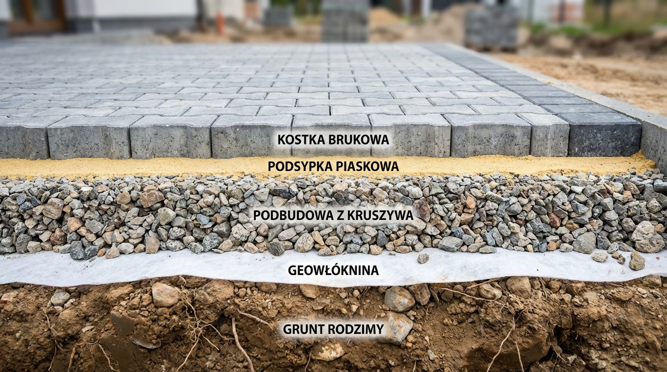 Po wytyczeniu przebiegu ścieżki czy podjazdu, należy wyrównać podłoże rodzime. Ewentualne ubytki uzupełnia się grubym piaskiem lub pospółką (warstwa nie grubsza niż 10 cm), a następnie całość starannie zagęszcza mechanicznie.