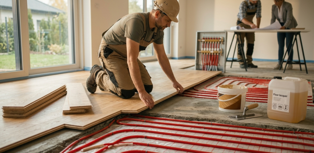 - Poinformować projektanta: Instalacja pod drewnianą podłogą wymaga innego zaprojektowania – rury grzewcze muszą być rozłożone gęściej i bardziej równomiernie (bez tzw. stref brzegowych o zwiększonej mocy), aby uniknąć punktowego przegrzewania drewna.